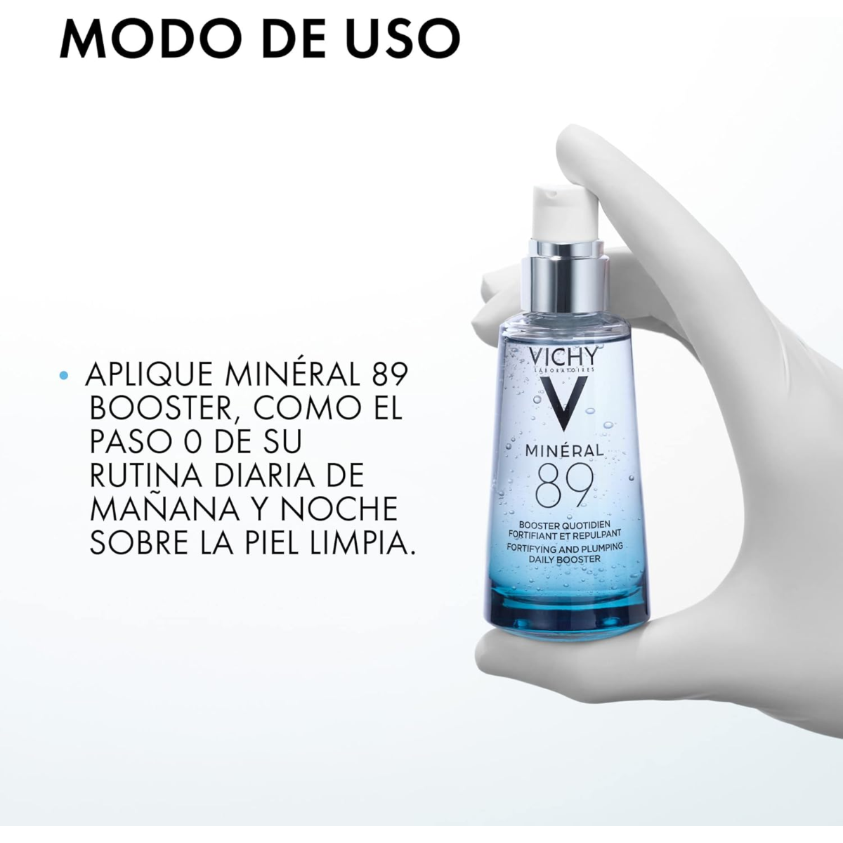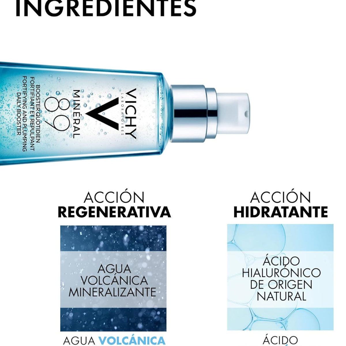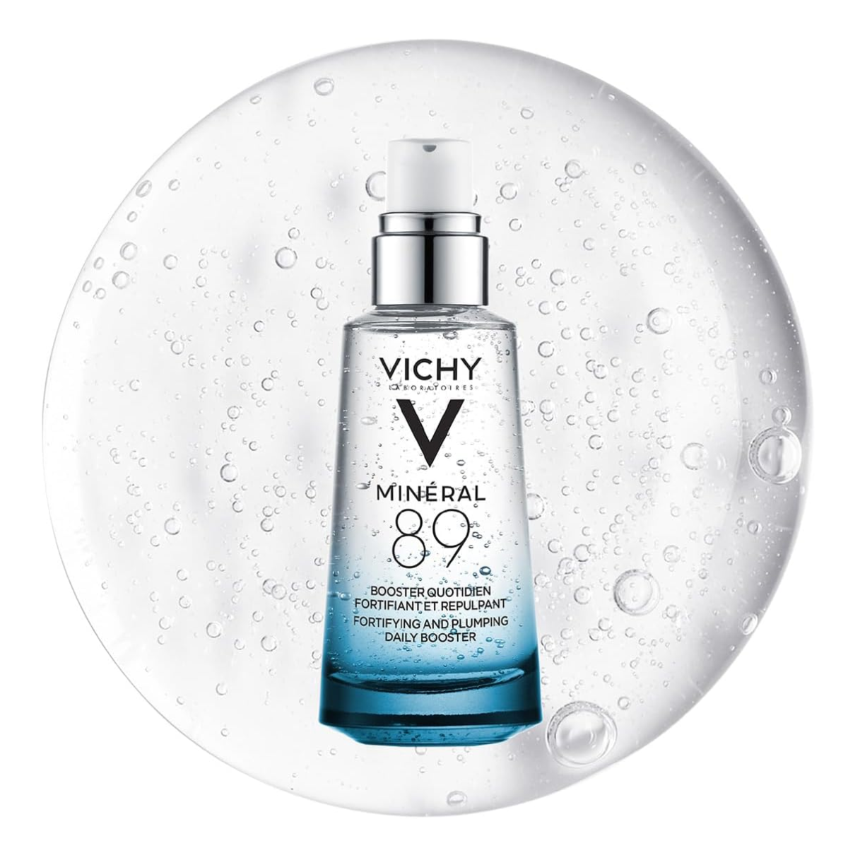 Mineral 89 Sérum de uso diario, fortificante, rellenante e hidratante compuesto por un 89% de Agua Mineraliza Volcánica Vichy y Ácido Hialurónico de origen natural.