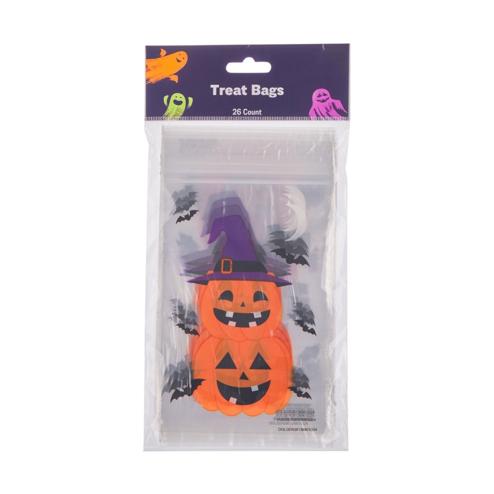 Viene en un paquete de 26 bolsas con diseños variados de Halloween.