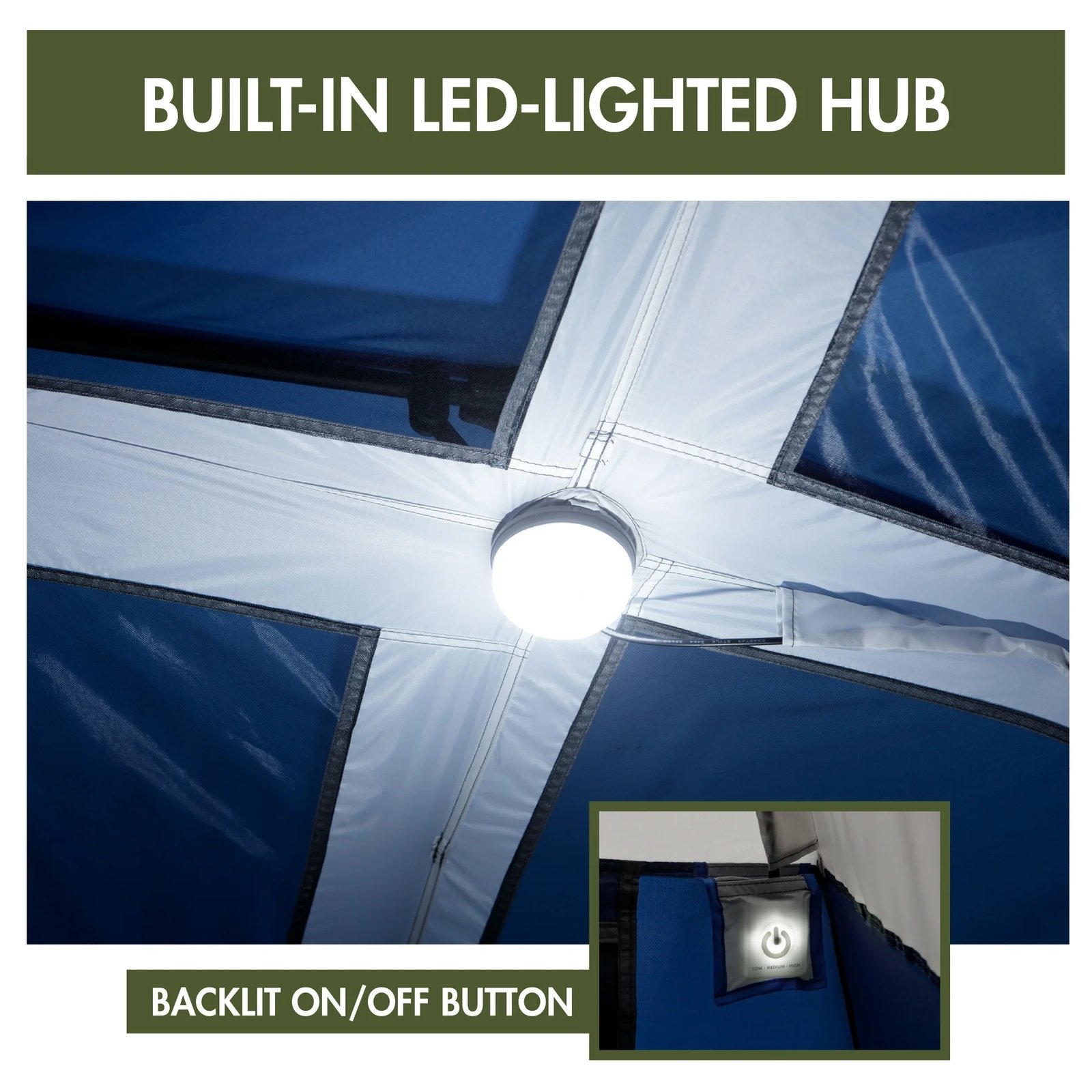 Mejore su próxima aventura al aire libre con la carpa Ozark Trail de 4 personas con cabina instantánea y Hub con iluminación led.                                                                Esta espaciosa tienda de campaña estilo cabina no requiere ensamblaje porque los postes están prefijados a la tienda, por lo que todo lo que necesita hacer es desempacar, desplegar y extender.                                                                                                                                                                                                                    Esta tienda cuenta con tres grandes ventanas de bolsa y un respiradero de CA ajustable para mejorar la circulación de aire en toda la tienda.                                            Esta tienda se adapta cómodamente a una cama de aire de matrimonio o hasta 4 campistas en sacos de dormir en el suelo.                                                                          Manténgase organizado y conectado con los bolsillos de almacenamiento de bolsa incluidos y el acceso al cable eléctrico.                                                                            El cubo con iluminación LED ambiental permite una luz increíble en toda la tienda y se puede ajustar con la configuración baja, media y alta.                                                Esta carpa cuenta con una zíper de puerta anti-snag, bolsa no-see-um y recubrimiento resistente al agua de 1200 mm.                                                                                Esta carpa de cabina instantánea de 4 personas Ozark Trail con led Lighted Hub es perfecta para su próxima aventura de campamento familiar.