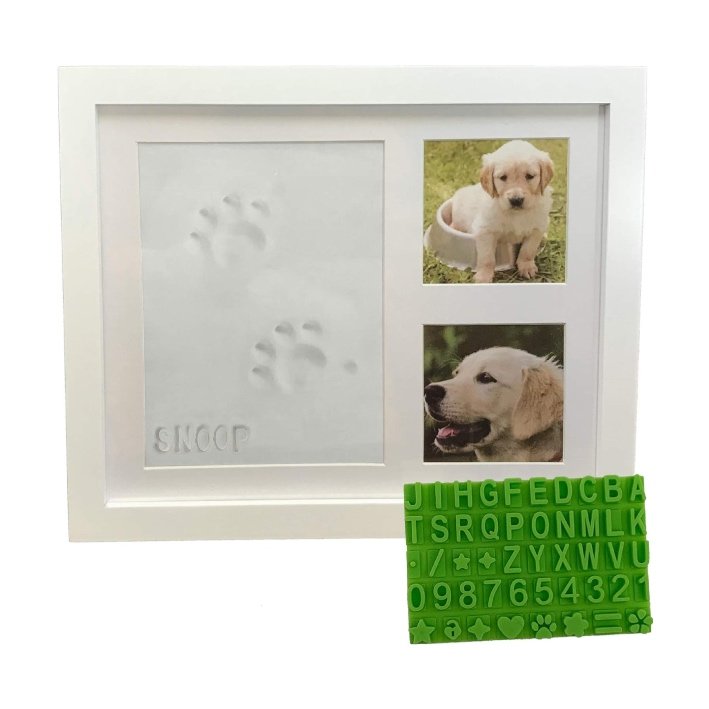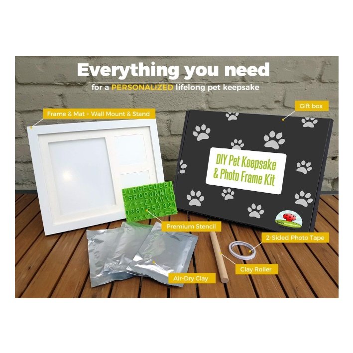 Un recuerdo atemporal: captura la huella de la pata de tu mejor amigo para un recuerdo atemporal o memorial. Nuestro kit incluye todo lo que necesitas: marco de madera de alta calidad (con soporte de montaje y soporte), arcilla no tóxica apta para mascotas, rodillo, kit de plantillas y cinta adhesiva de doble cara para colocar tus fotos favoritas.