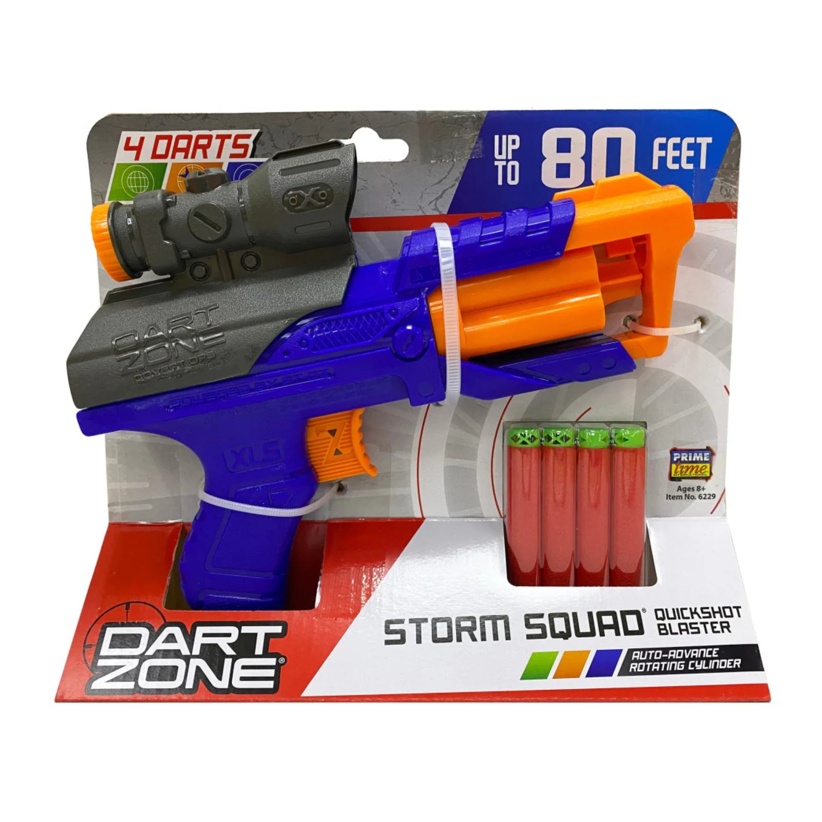 ¡El Dart Zone® Storm Squad dispara 4 dardos de espuma hasta 80 pies!